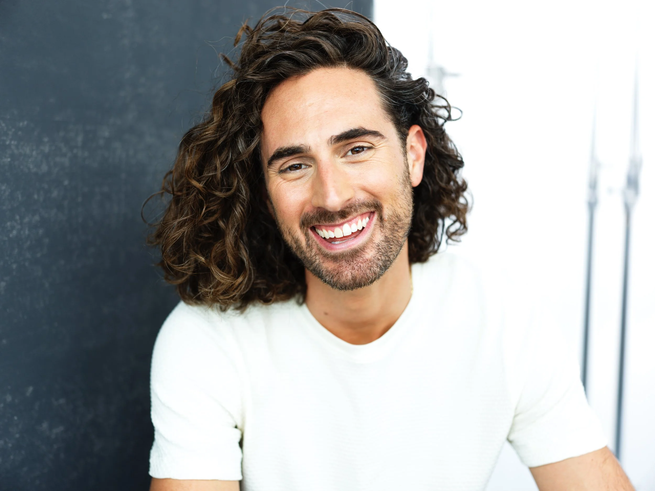 Smiling young man with long, curly hair and a beard wearing a white shirt. Eric M Grant. Actor. New York City.